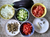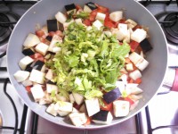 2 - Após refogar, vá adicionando e misturando o pimentão, os tomates, a berinjela, o aipo e as azeitonas
