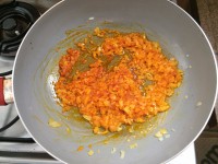 1 - Aqueça o azeite em uma caçarola e refogue a cebola. Acrescente o colorau e refogue por mais alguns minutos