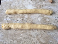 4 - Separe a massa em duas metades. Faça um rolo com cada metade e corte pedaços iguais de massa de cada rolo*