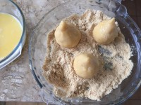 5 - Passe cada coxinha primeiro pela água, depois pelos ovos batidos e termine com a farinha de rosca.