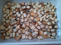 4 - Coloque os cubinhos de pão, salpique com sal, pimenta do reino e os temperos desidratados