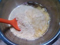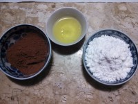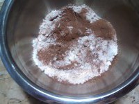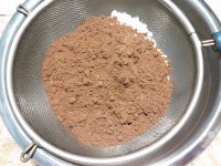 2 - Em uma vasilha adicione as claras (sem bater), as amêndoas e peneire o cacau e o açucar de confeiteiro